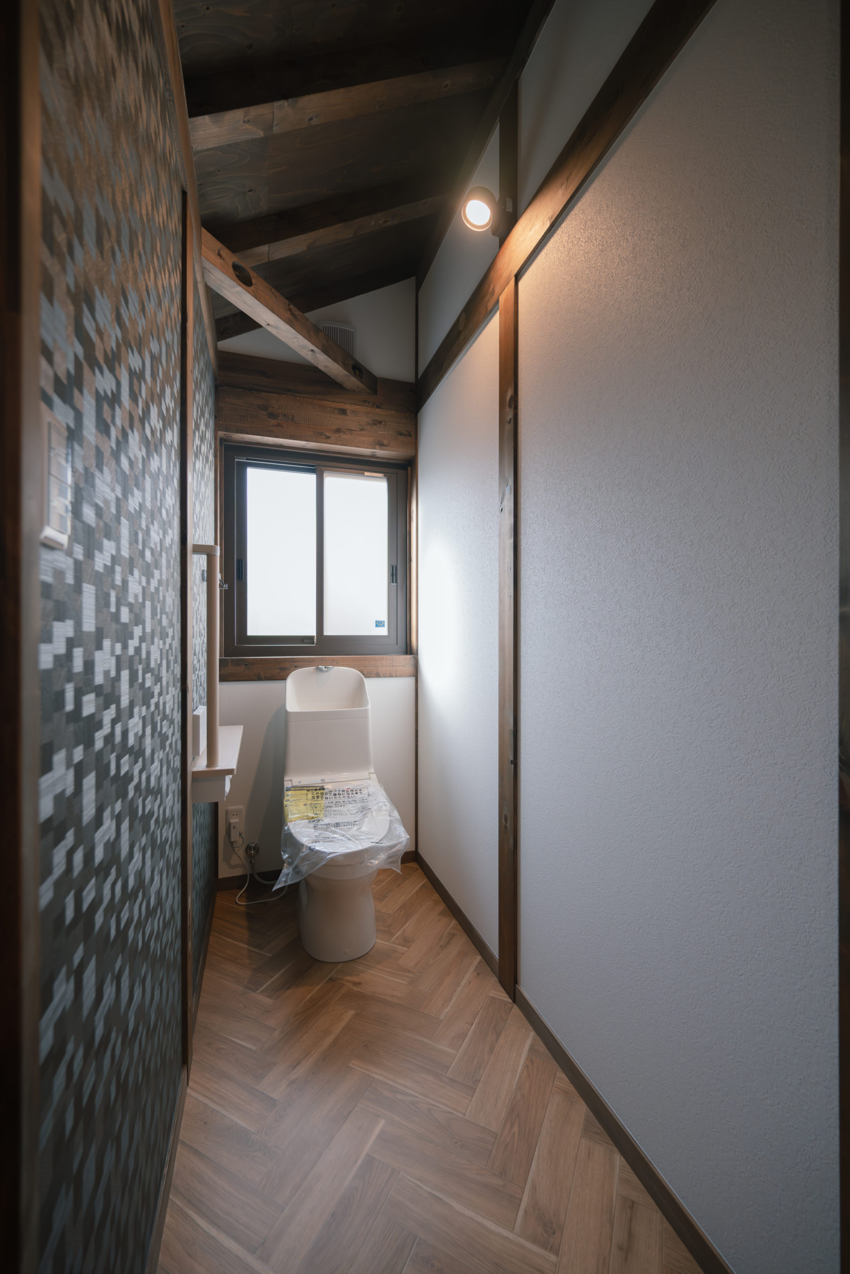 広々とした洗面所とトイレの床には、ヘリンボーン柄にしてアクセントを。
