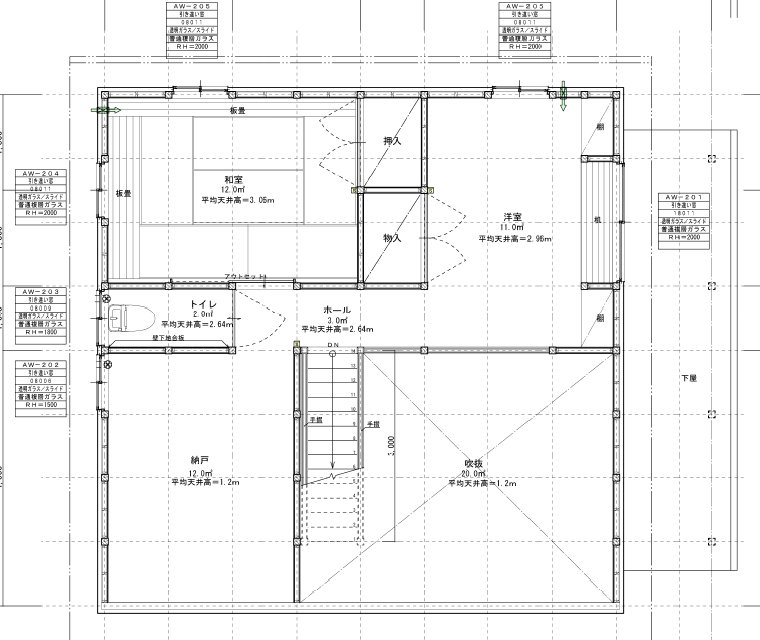 玄関側から見ると平屋のように見えますが、1.5階のロフトスタイルを採用。